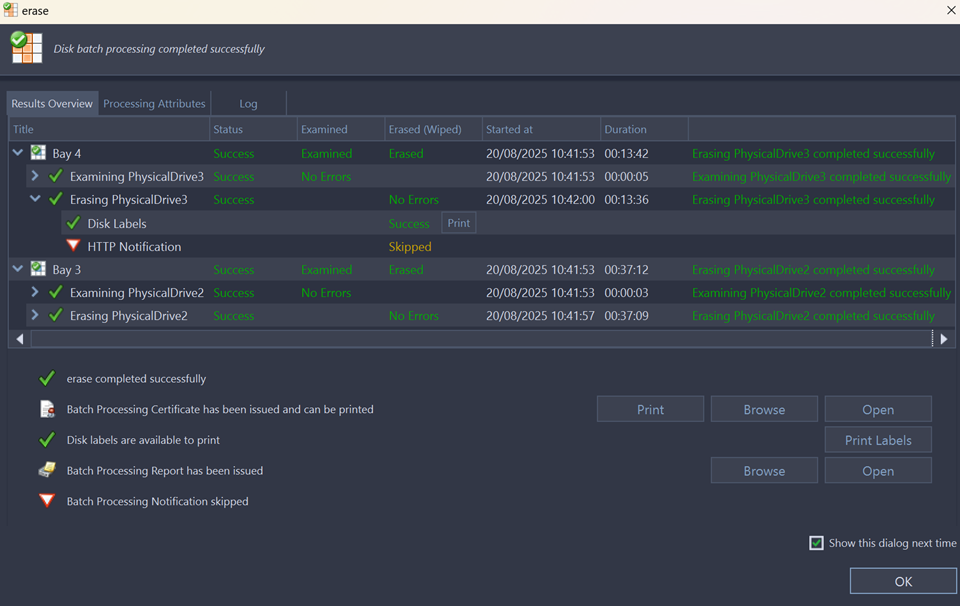 Once the KillDisk Industrial System finishes processing tasks, a Processing Summary dialog appears. It contains all information regarding the performed task, including starting attributes, logs, and detailed results. It also provides an opportunity to generate additional outputs (prints) if applicable