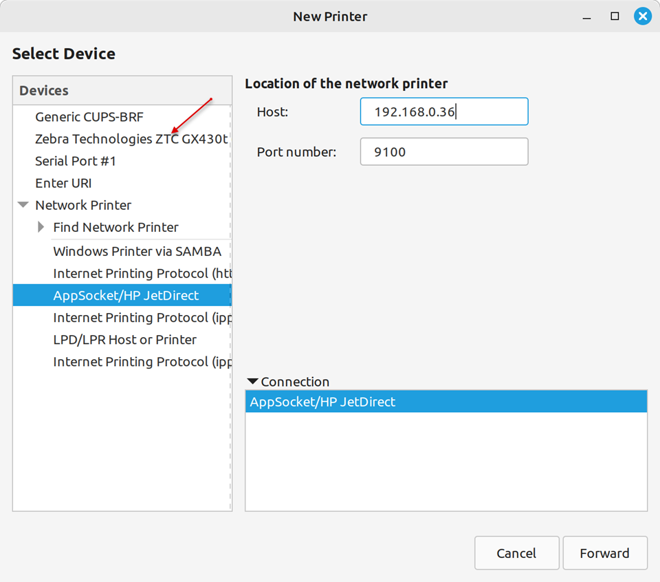 - For network connection, select Network Printer > AppSocket/HP JetDirect and enter the network address in the Host field.