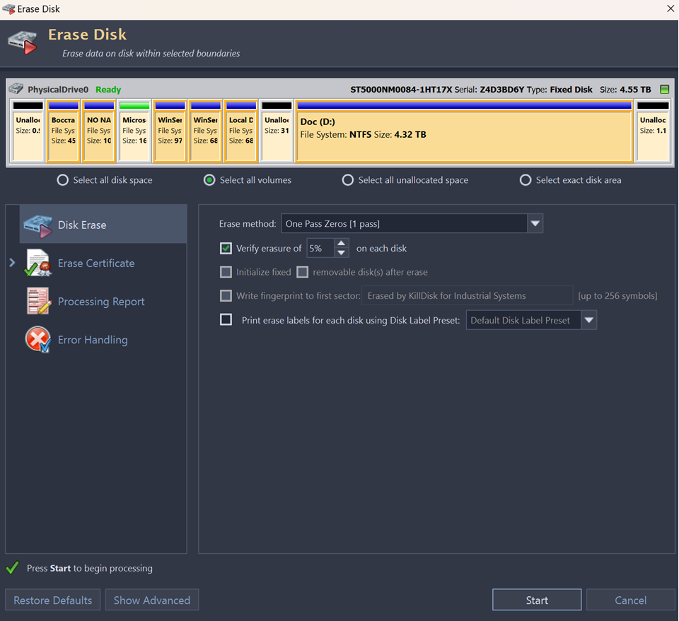 KillDisk Industrial has an option to specify a particular area on the disk to erase. To access this feature you have to select the single disk first. In Local Devices view initiate the Erase Disk command.
