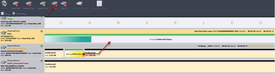 If there are any errors, for example due to bad sectors, these errors will be reported and placed to the log file. If such a message appears you may cancel the operation or continue wiping out disks.