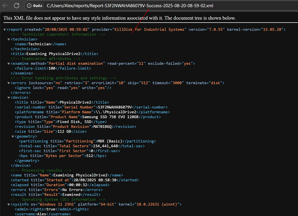 KillDisk Industrial gives you the option to store XML reports for any major operation it performs (Disk Erase, Secure Erase, Examine Disk Physical Integrity, Disk Clone and Disk Wipe) on a disk.