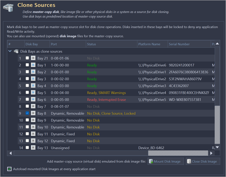 Any recognized physical disk can be used as a master-copy for cloning. Simply find the disk under the Disks Bays as clone sources and check the box next to the desired Disk Bay. This disk will be locked and read/write operations will be restricted until the cloning operation is complete.