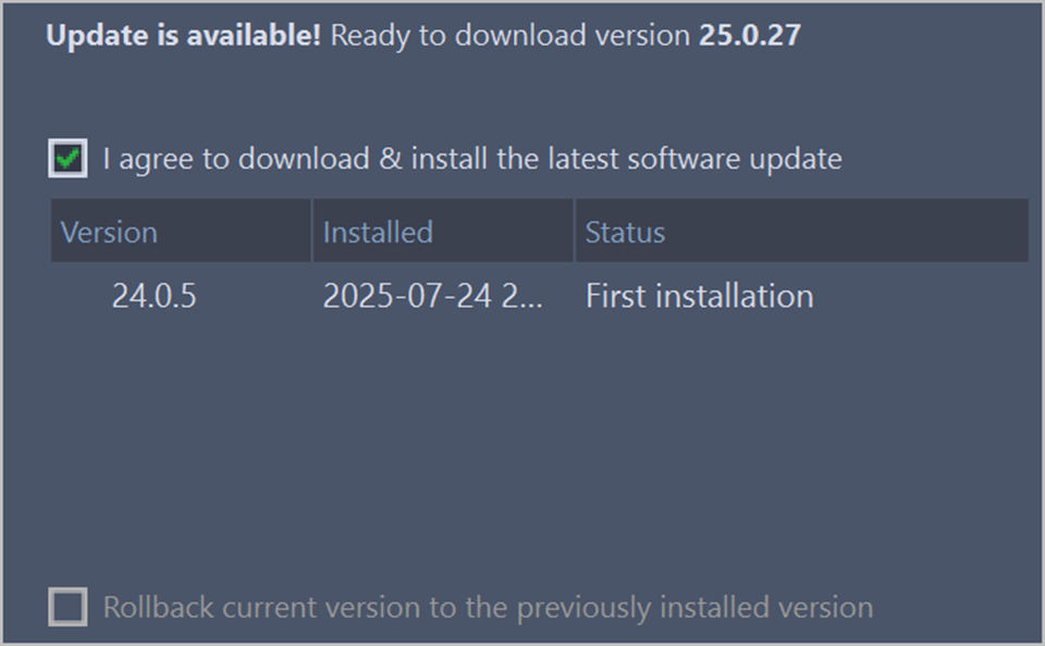 KillDisk Industrial stores your previously installed versions so you may roll back to any of your older versions at any time. To rollback to a previous version, just select the target version, mark the Rollback to previously installed version check box, and click the Next button.