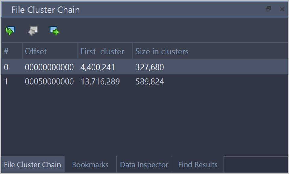 File cluster chain is one of the essential approach to analyze file data integrity and file recovery. To help navigate through the content of an open file, file's cluster chain, shown sequence number, offset and size of each chain, is displayed in File Cluster Chain view.