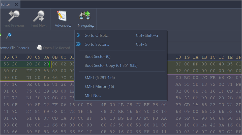 Some of the access points when used automatically select a corresponding Templates (Patterns). For example, if a boot sector access point is selected, a Boot Sector template is applied to the boot sector offset.