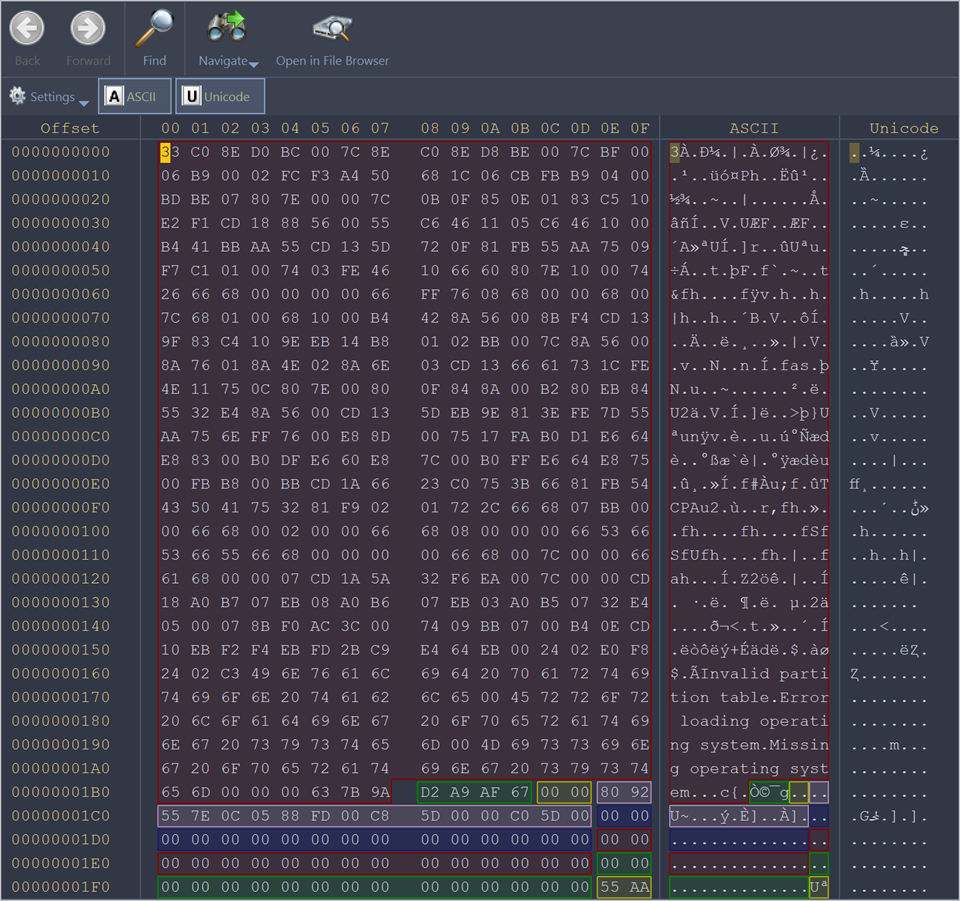 After you have opened an object with the Disk Viewer, you may navigate by scrolling block by block, or by jumping directly to specific addresses. You may jump to disk system records such as the boot sector (primary and copy) or a partition table.
