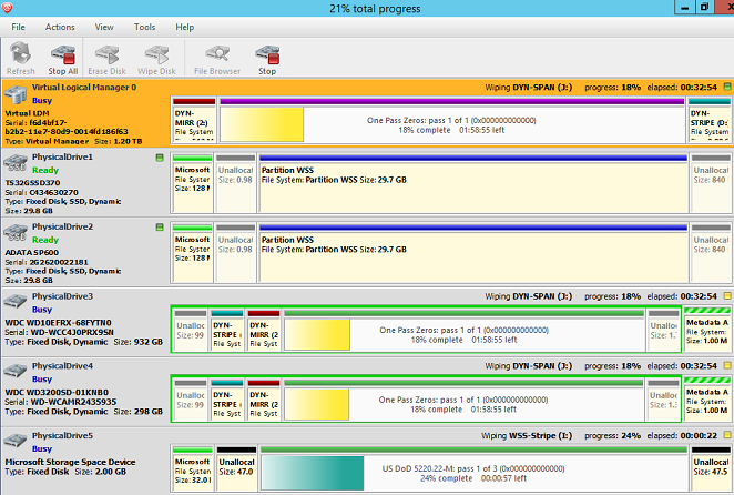 Virtual Disks are virtual devices which look like regular physical disks to all applications. These virtual devices are stored on one or more physical disks and emulate different types of volumes and RAID disk arrays not on a hardware level (inside disk controller), but on Operating System level (software emulation). Virtual devices are fully supported by the KillDisk Industrial. These disks will appear in Local Devices view like any other regular disks. When you launch an erase for the virtual disk, the progress is displayed in the same color on all components of the composite virtual drive.