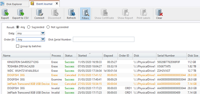 Event Journal is a feature that allows to collect and export all operations history. Once current KillDisk operation completes, the results have been added to the Event Journal or Log stored in the local database and are available for reviewing, filtering and exporting to the external source.